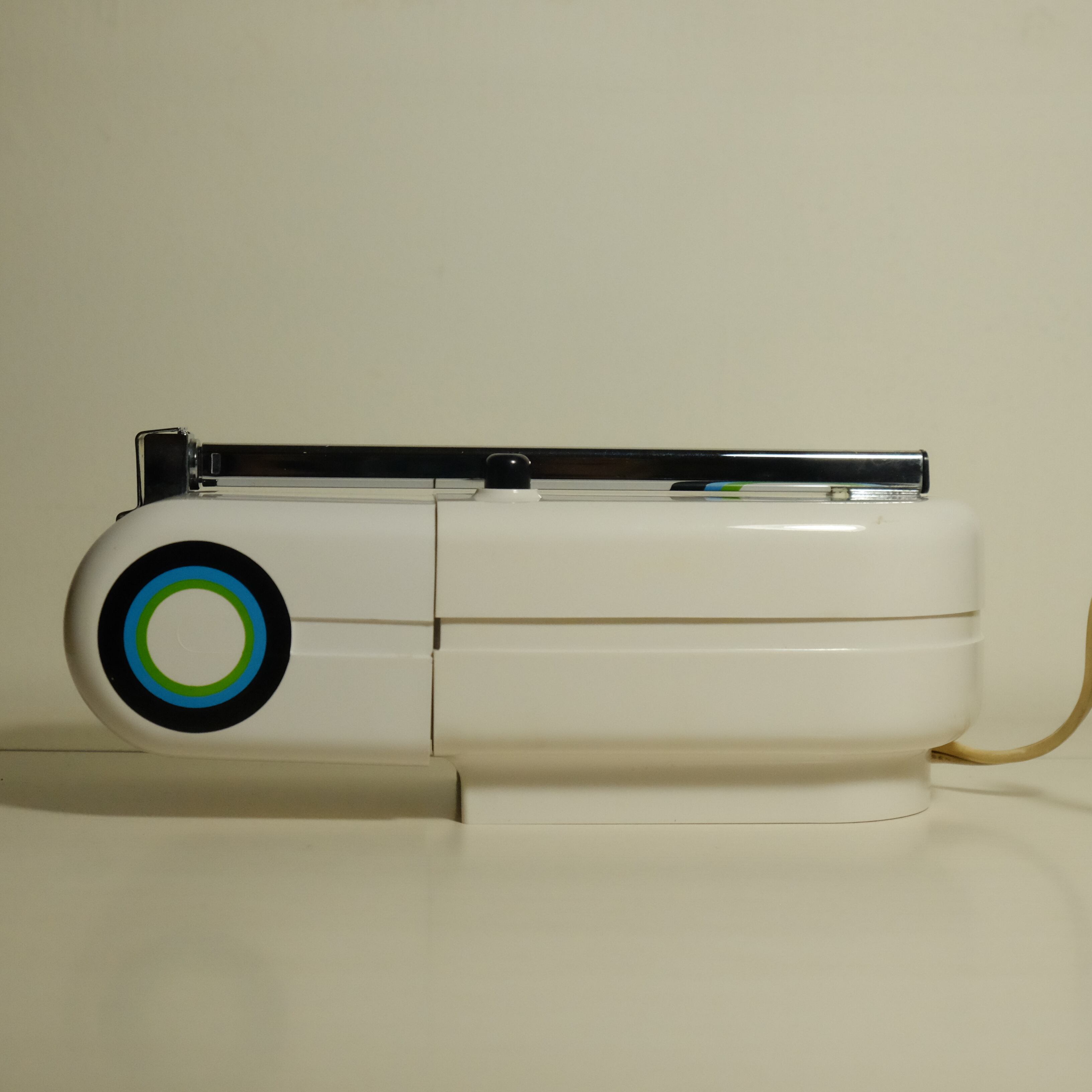 白いボディに緑、水色、黒の丸が印象的なデザインのスタンドライト。