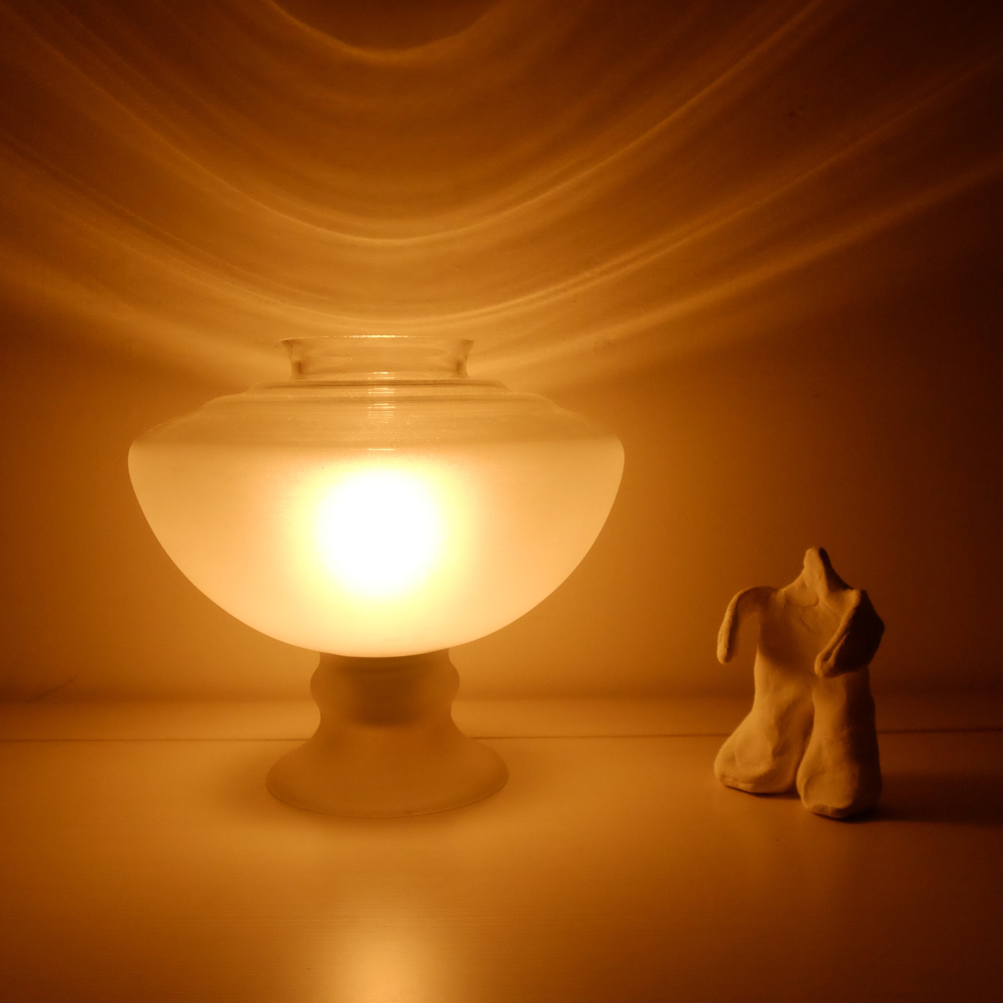 点灯させると上部にはガラスの波紋が、下には柔らかく光が広がります。