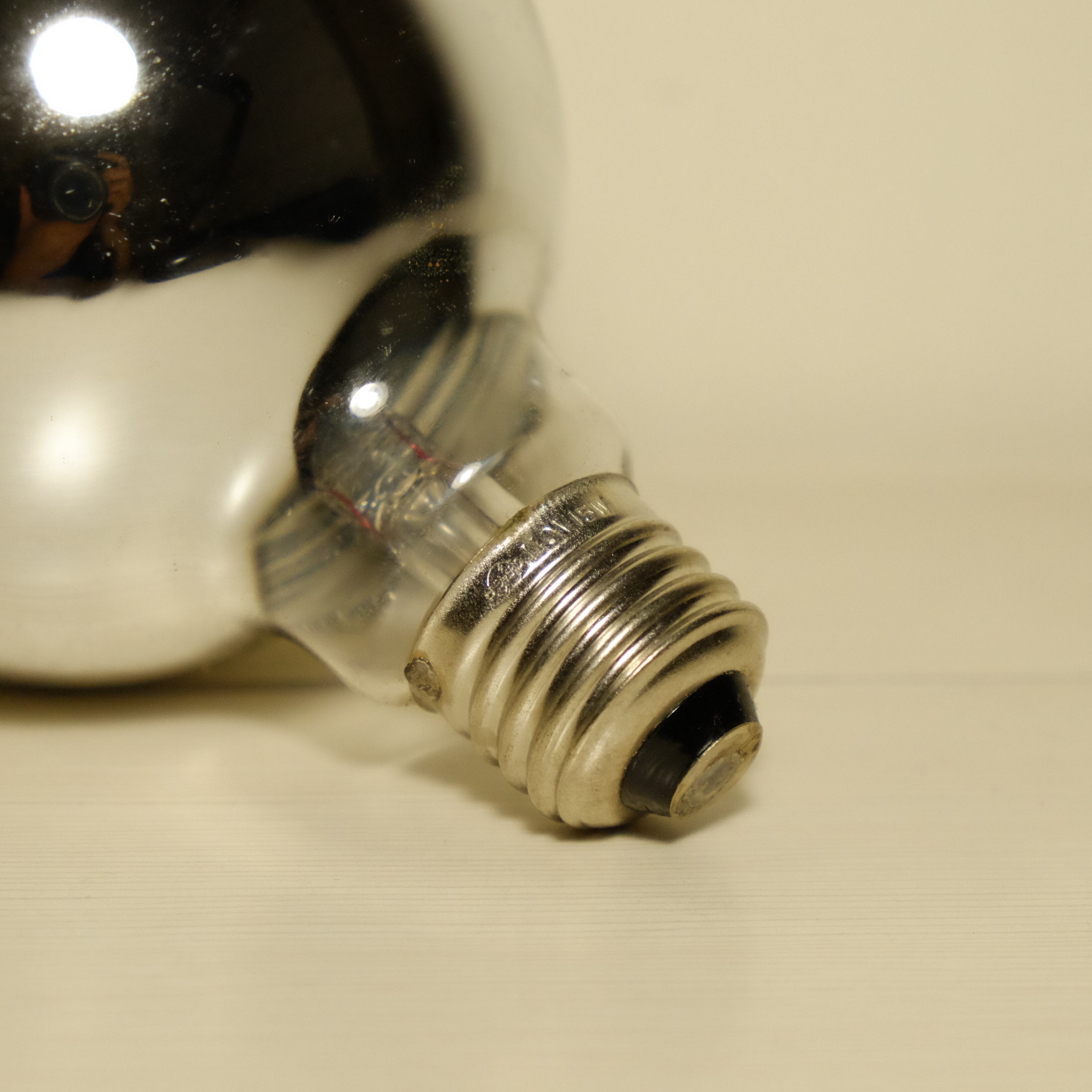 銀色の塗料がガラス球の内側に蒸着されている電球です。点灯していない時はまるで鏡のよう。