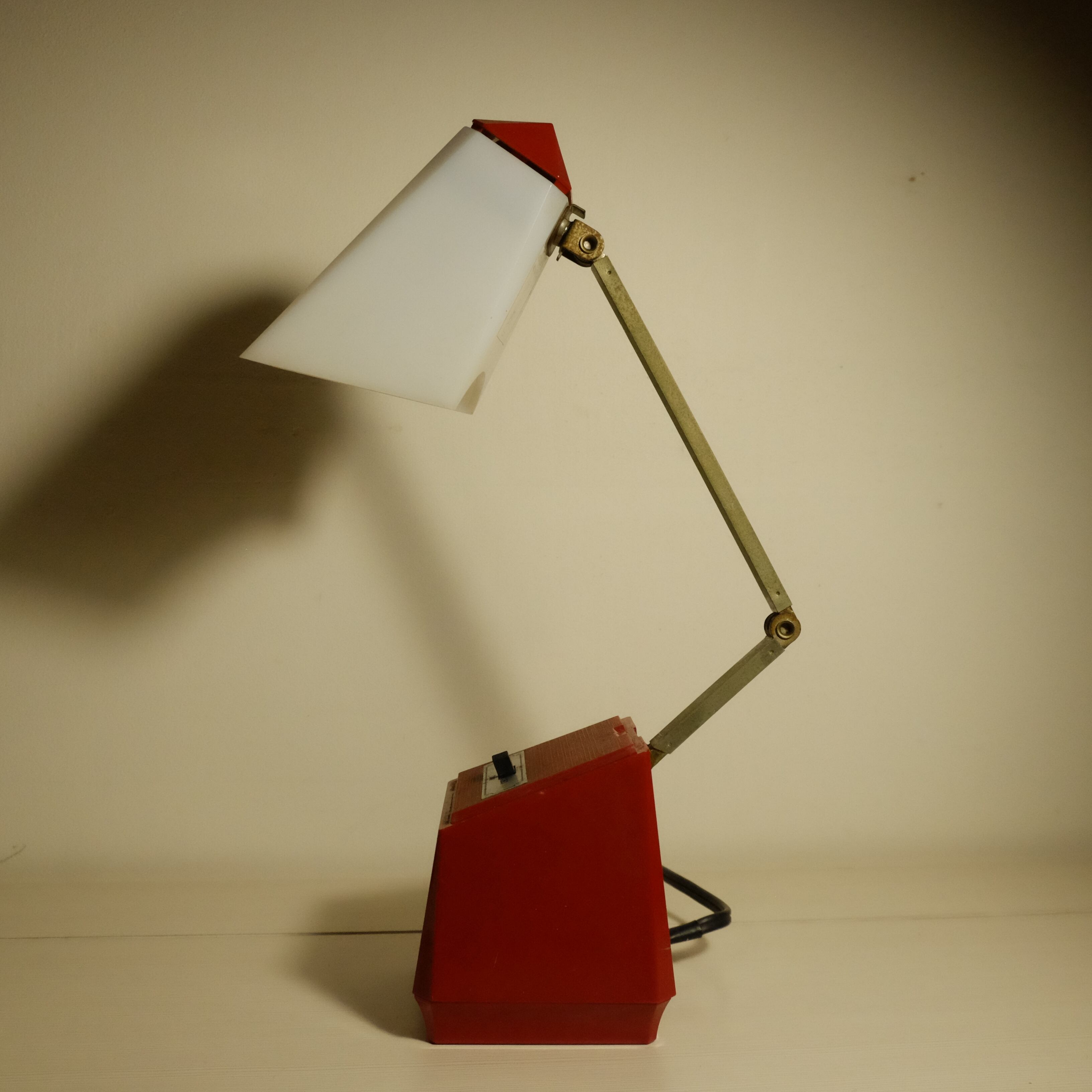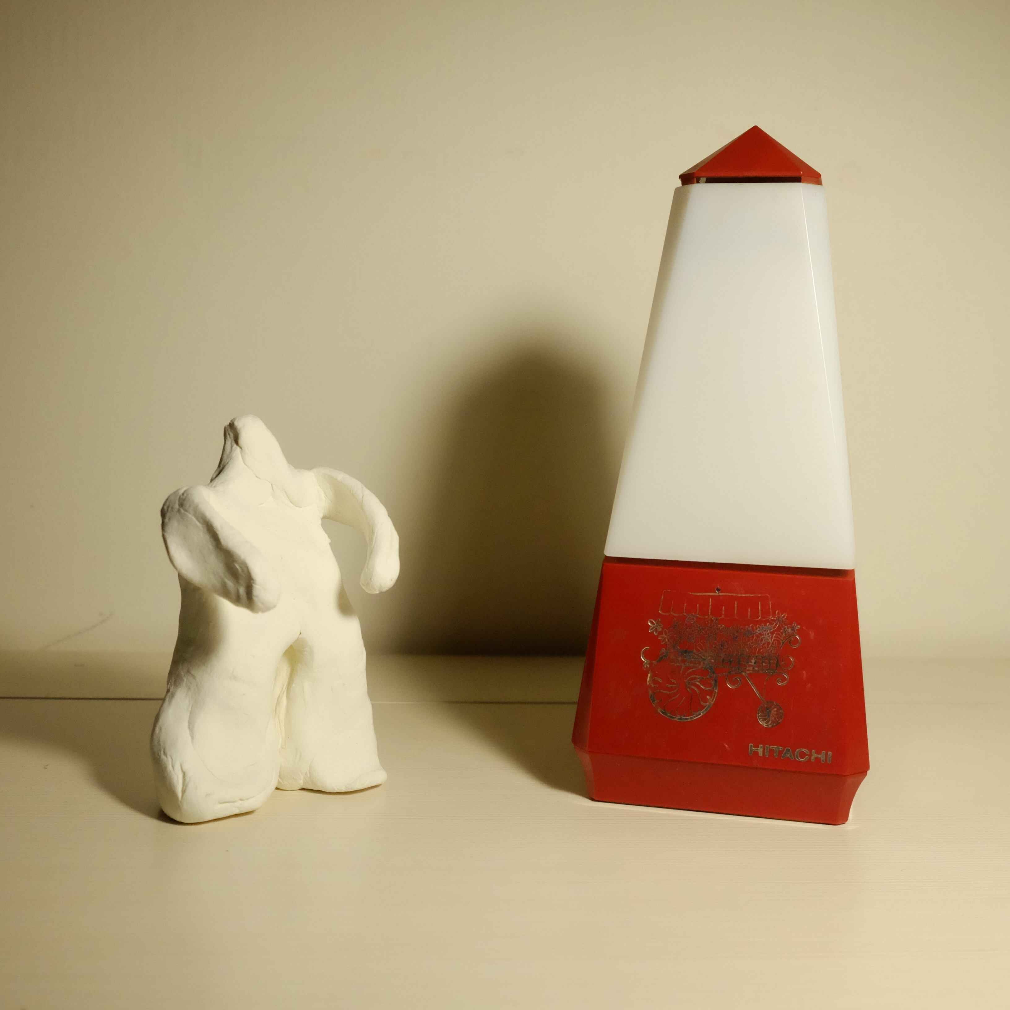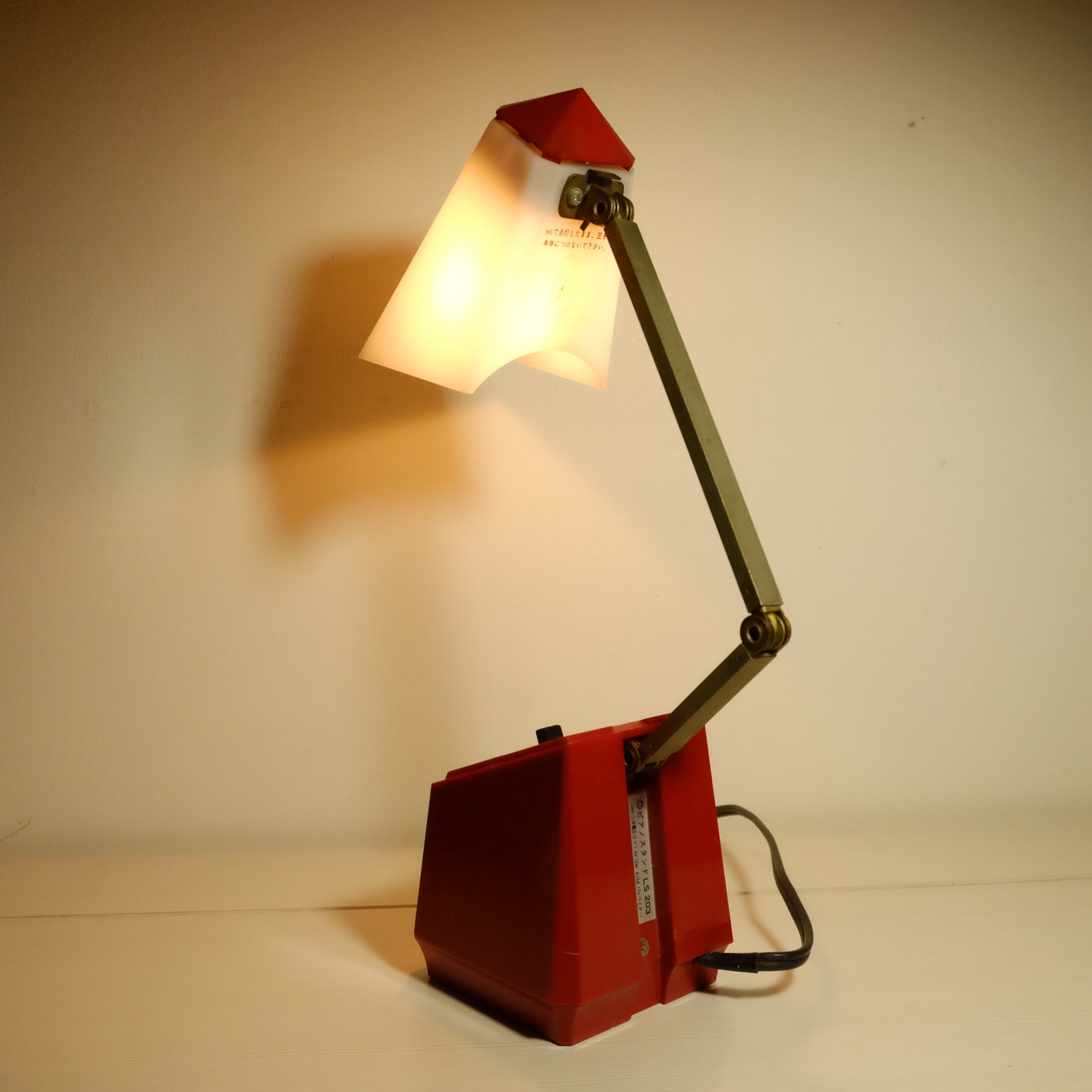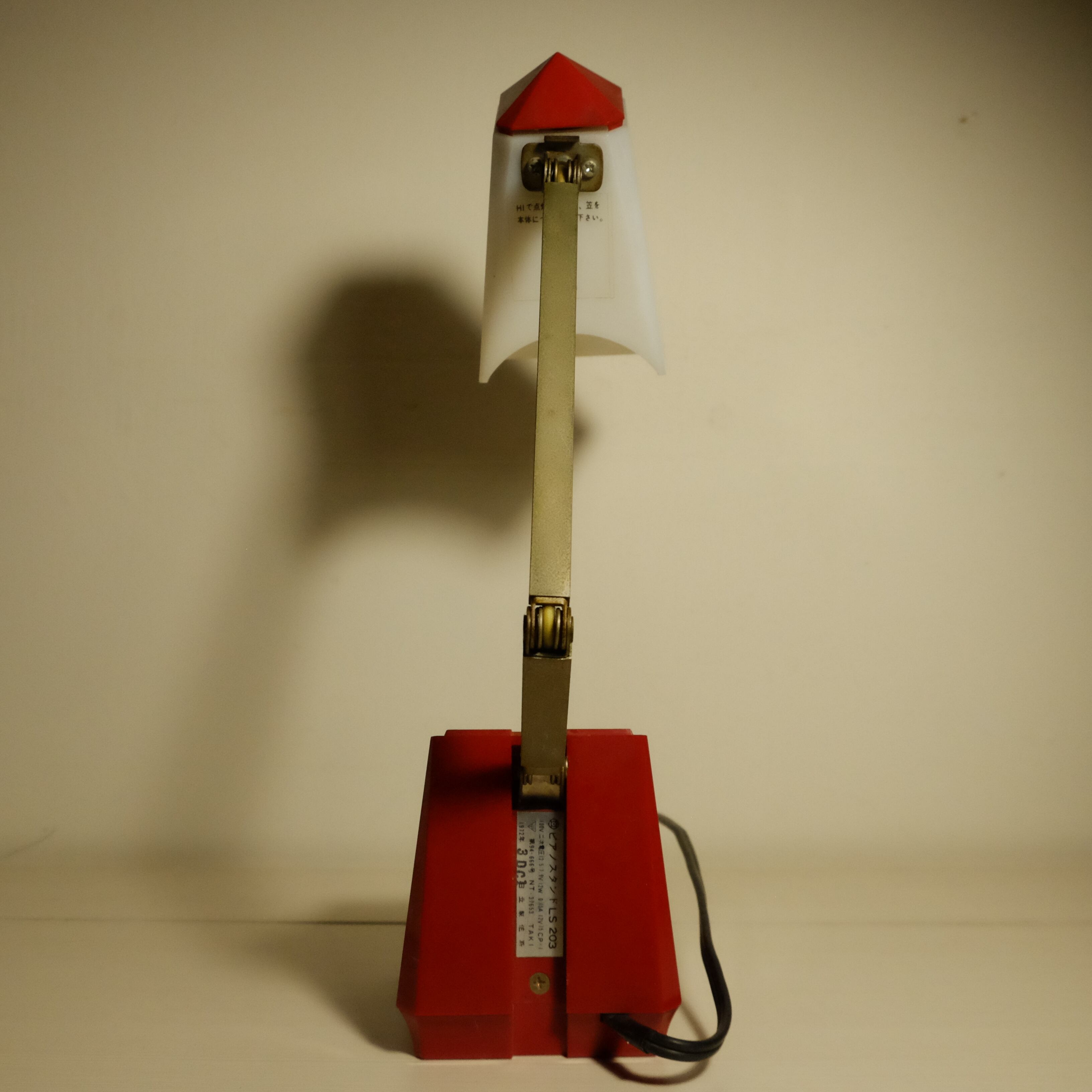 赤と白の、おうちのような、鉛筆のような形の折り畳みスタンドライト。
