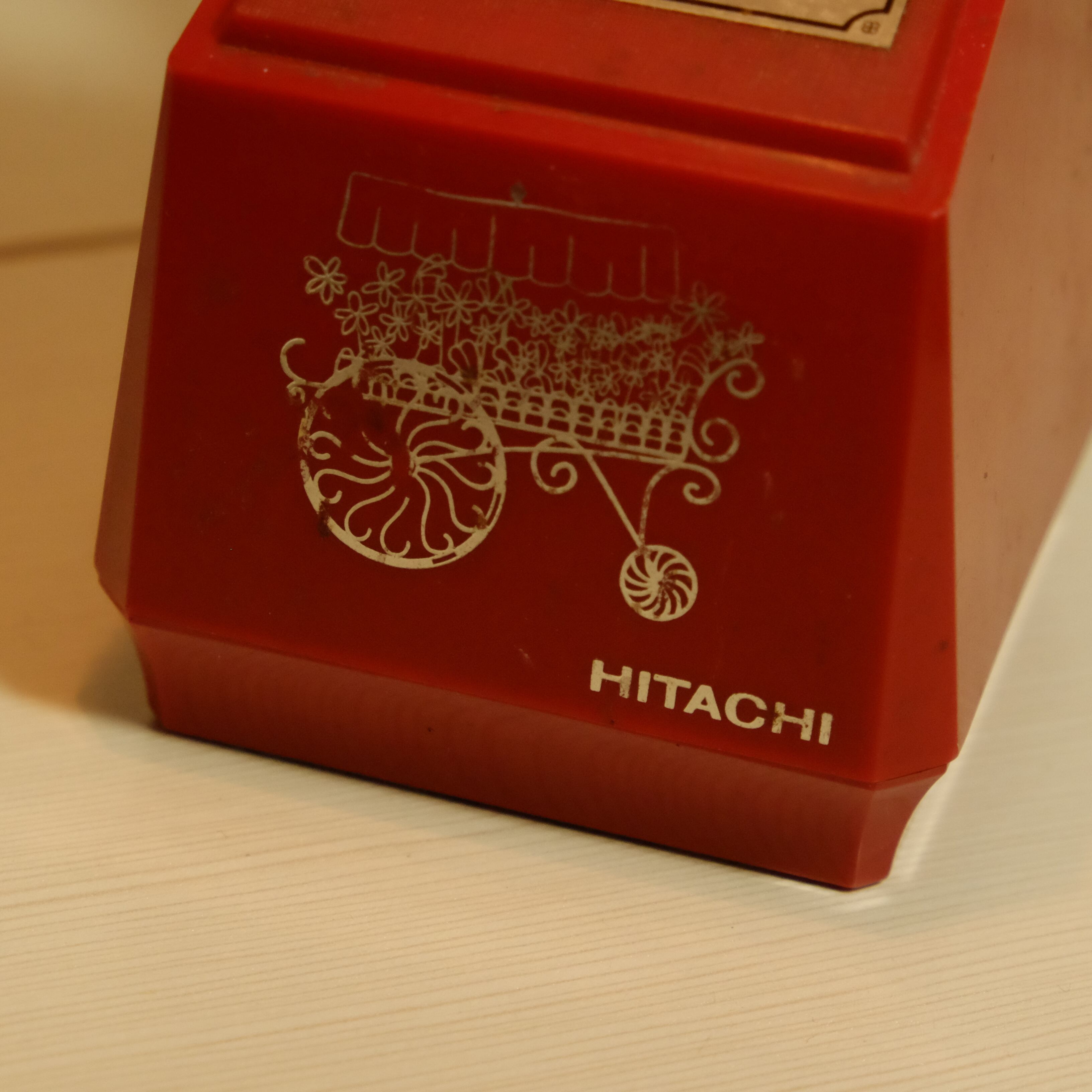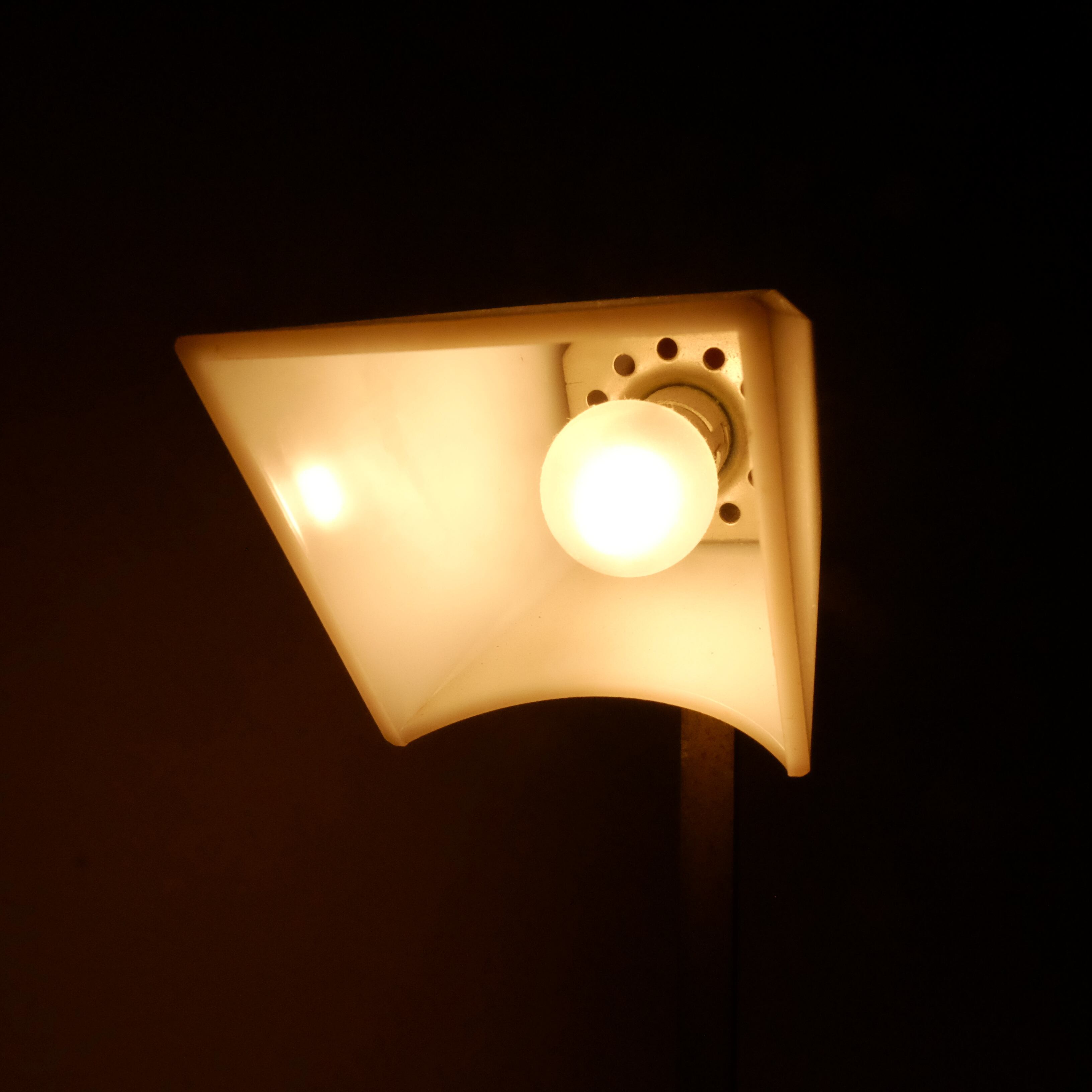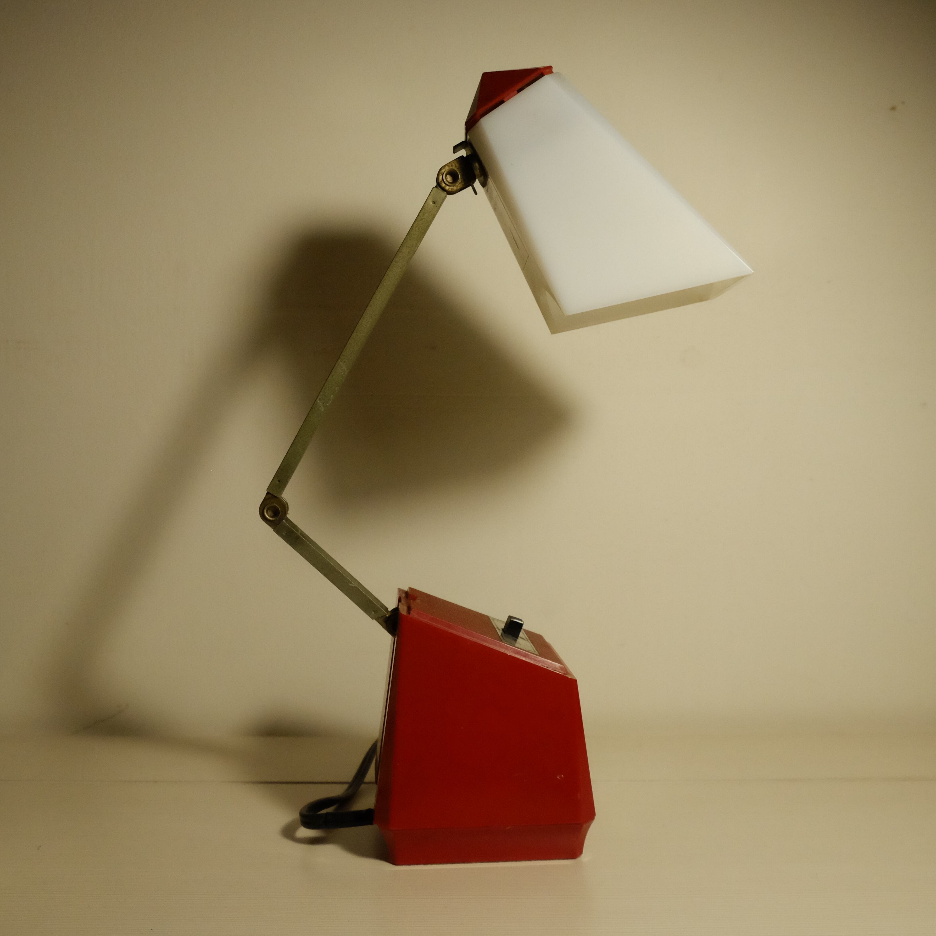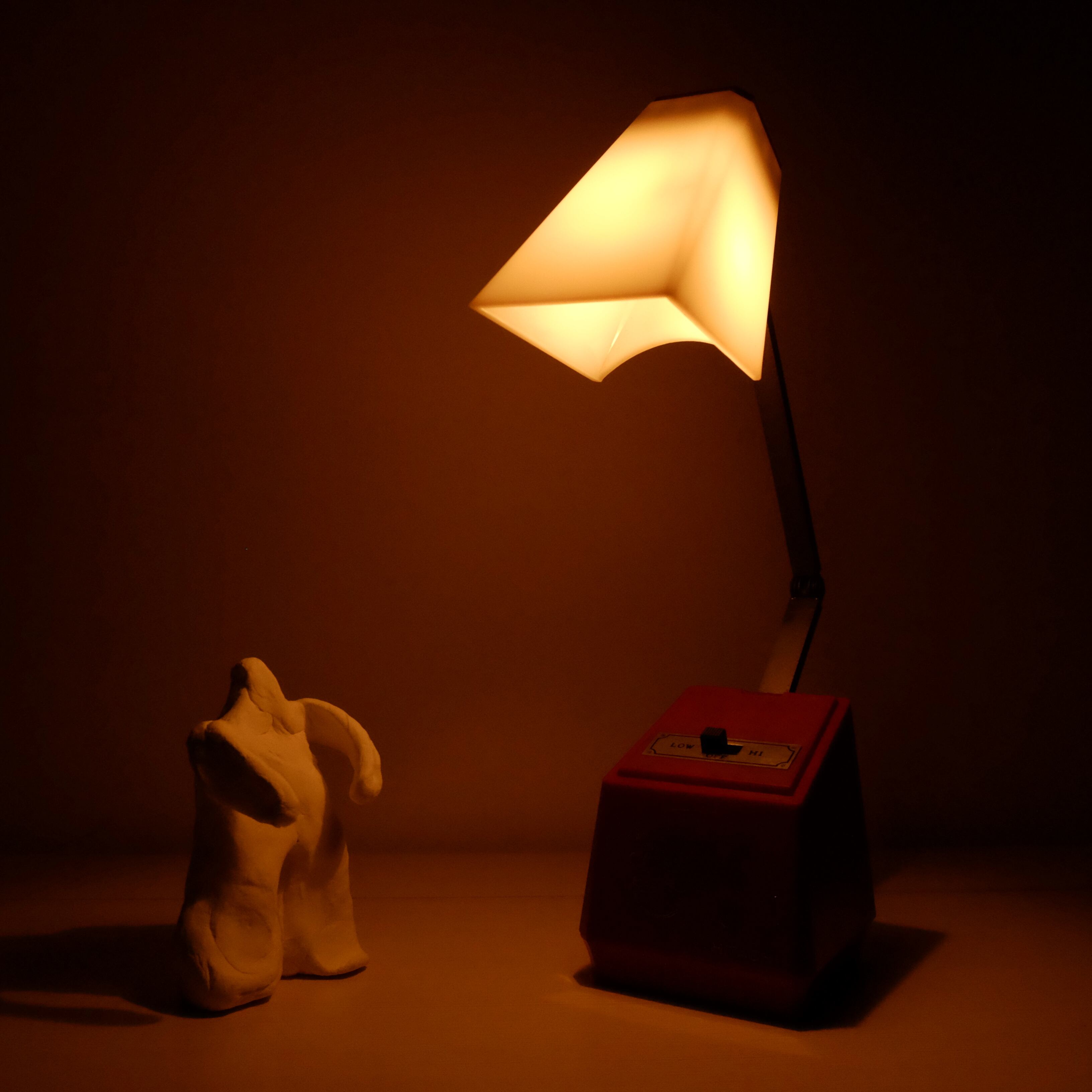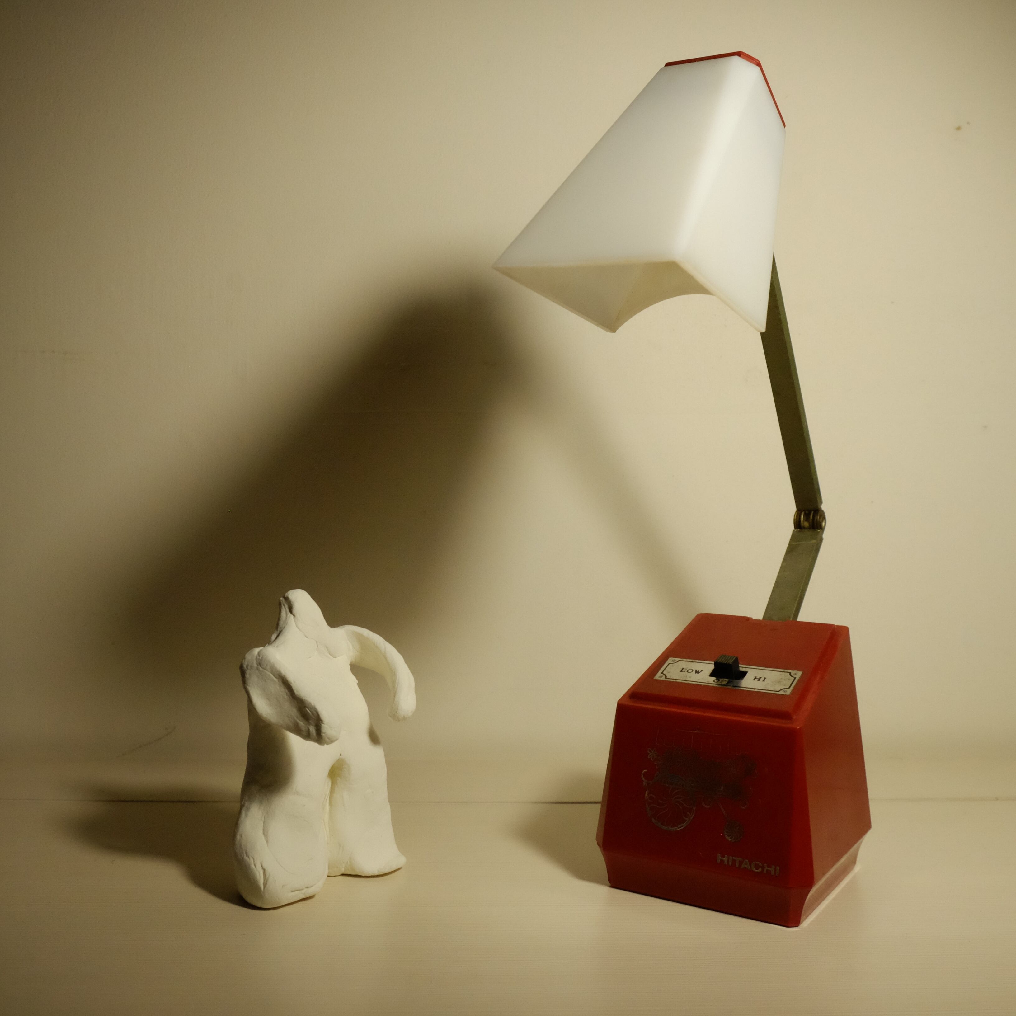 赤と白の、おうちのような、鉛筆のような形の折り畳みスタンドライト。